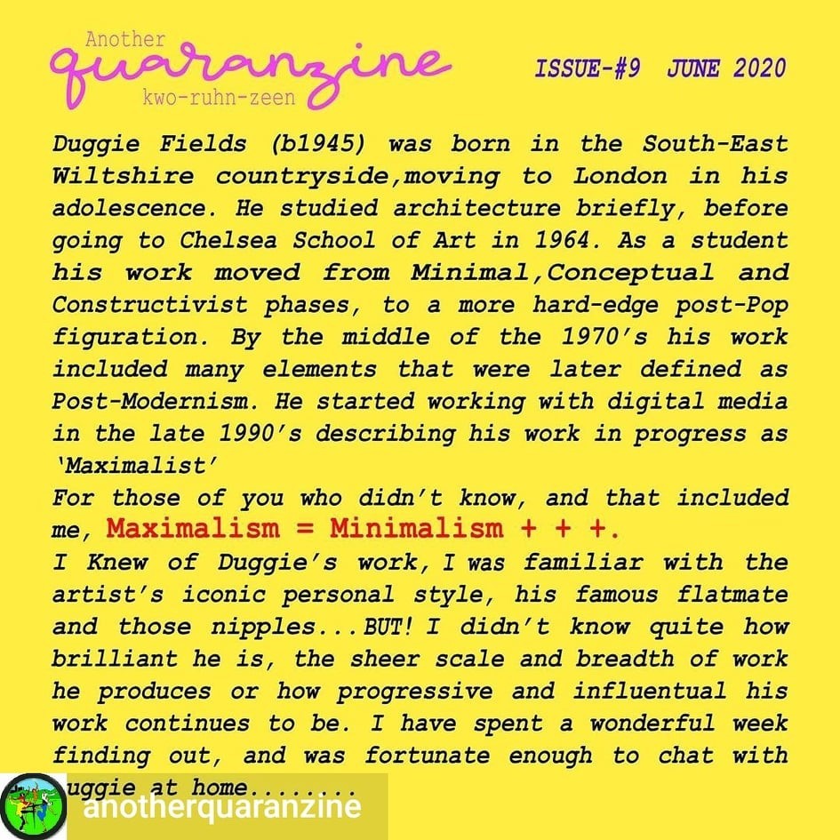 2016 - Duggie Fields was celebrated by the British Film Institute FLARE with a collection of his videos. Fields could have been responsible for the Free the Nipple Campaign and was the designer of posters for London Transport.